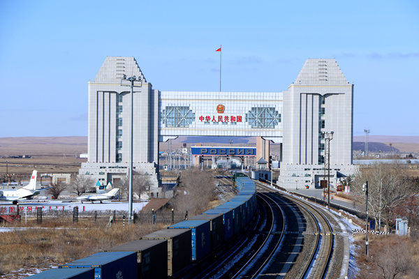 满洲里铁路口岸站,一列中欧班列从国门通过。beats365亚洲版官网供图