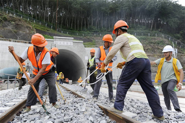 10月12日上午,在中老铁路曼木树隧道出口,中国中铁一局施工人员操作我国自主研制的新型长轨牵引车,将最后一组500米长钢轨精准推送到位,标志着中(国)老(挝)昆...