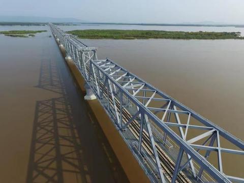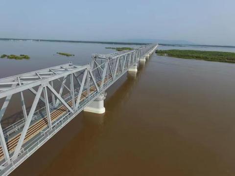新建同江中俄黑龙江铁路大桥位于中国黑龙江省同江市与俄罗斯下列宁斯阔耶市之间,桥梁全长7194米,引桥长4979米,主桥长2215米,其中中方境内主桥长1886米,俄方境内主桥长329米,设计运营时速100公里、年过货能力2100万吨。大桥工程2014年2月开工,2018年10月中方段主体工程完成,2019年7月中方段完成静态验收、动态验收、初步验收和安全评估等全部验收程序。