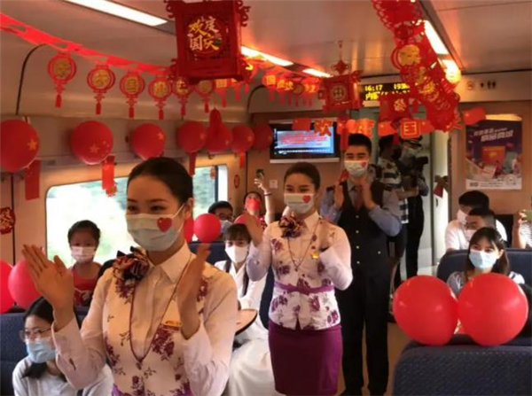 在布满红色气球、灯笼和窗花妆点的车厢,旅客们挥舞着手中的五星红旗共同高歌欢唱祖国,歌声、掌声、欢笑声久久回荡……这里是成都客运段首发雅安到重庆北直达动车组列车“迎国庆、庆首发”活动现场,“以前要从雅安乘动车到成都西站,再从西站辗转到成都东站,再乘高铁到重庆,几经周折才能回到家,现在雅安直达重庆北,实在太方便了!”在雅安环保部门工作的一位年轻人兴致勃勃地说。