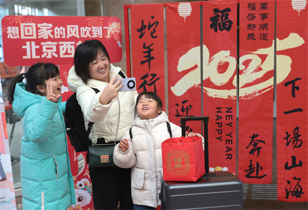 1月14日,北京西站,旅客在候车时拍照留念。中国日报记者 邹红 摄