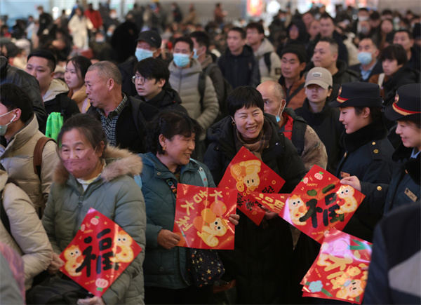 1月14日,北京西站,工作人员向旅客发放新春福字。中国日报记者 邹红 摄