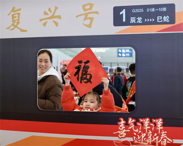 1月14日,山西太原南站,小朋友在复兴号高铁背景版展示“福”字。中国日报记者 朱兴鑫 摄