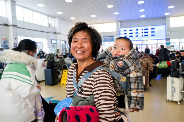 1月14日,浙江湖州长兴南站,一位奶奶背着孙子赶赴回家的火车。谭云俸 摄