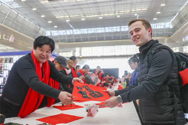 1月14日,江苏南京南站,志愿者为外国友人送上手写春联。史俊 摄