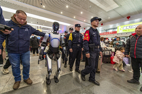1月14日,浙江金华站,铁路公安民警和可进行智能化巡逻的“机械战警”一起在候车室巡逻。胡肖飞 摄