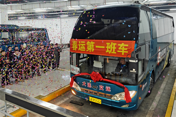 1月14日,辽宁大连北站长途客运站,旅客乘坐“春运第一班车”返乡。刘德斌 摄