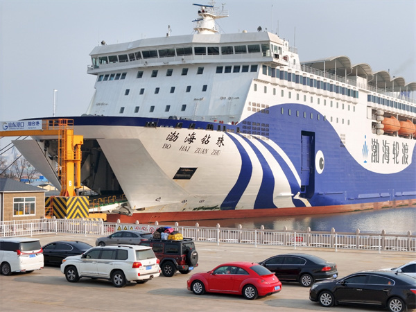 1月14日,山东港口烟台港,车辆准备驶入“渤海钻珠”号客滚船前往大连。唐克 摄