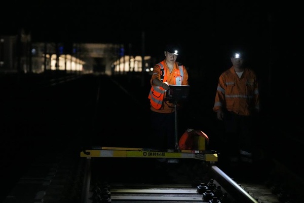 8月20日凌晨,宁波工务段轨道检查仪操作人员在杭台高铁线路轨道上巡检。新华社记者黄宗治 摄
