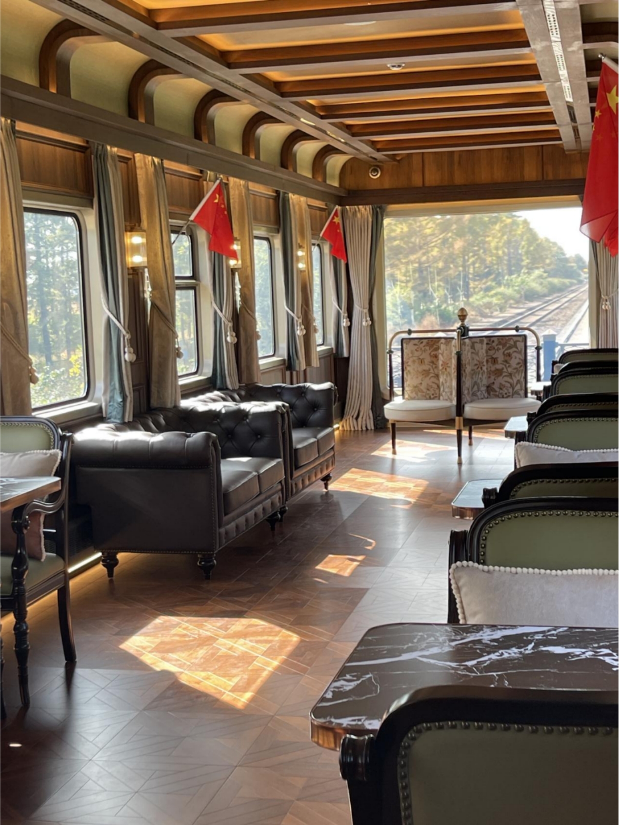 10月1日上午,哈尔滨站14站台国旗飘扬、花团锦簇,在《伊人之春》、《我在黑龙江等你》等悦耳的音乐声中,“伊春号”旅游列车首发仪式成功举行,来自全国各地以及新加坡、泰国、台湾等地的200余名中外游客齐聚冰城,开启了“游千里画廊,赏最美五花山”浪漫之旅。“伊春号”极具特色,外观为轻奢复古风格,车身主体颜色为深海蓝和珍珠金,车顶的白色突出亚冬会冰雪主题,无论是行进在“绿水青山”,还是“冰天雪地”间,都极具辨识度。列车整列编组11辆,最大亮点是其观光车的设计,其中有5辆休闲娱乐观光车是根据“行走的敖麓古雅”“红堡之夜”“金海岸漫步”“撒哈拉故事”“浪漫的温哥华”五个大洲文化特色和建筑风格设计;有2辆多功能观光车首创全景式观光车厢和怀旧式旅拍车尾,视野极为开阔,给游客们带来全新的观景体验。